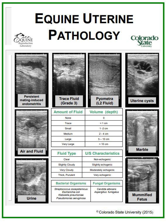 Ultrasound images of uterine abnormalities in the mare along with descriptions of uterine fluid volume and echogenicity characteristics.